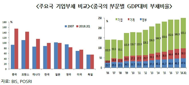 [글로벌이코노믹 윤용선 기자] 미국과 중국의 무역협상이 결렬된다면 어떠한 사태가 벌어질까. 중국발 금융위기가 찾아올 수 있다고 포스코경연구원(이하 포스리)은 최근 보고서 '다시 부각되는 중국 부채리스크'에서 밝혔다.포스리 사동철 수석연구원은 보고서에서 "중국의 총부채 규모는 2018년 6월 말 기준 GDP 대비 253%에 달하며, 글로벌 금융위기 이후 급증세를 보이고 있다"며 "특히, 중국의 기업부채는 총부채 중 가장 높은 비중인 61%를 차지하고 있으며, 2018년 6월 말 기준 GDP 대비 155%로 세계에서 가장 높은 편에 속한다"고 전했다.