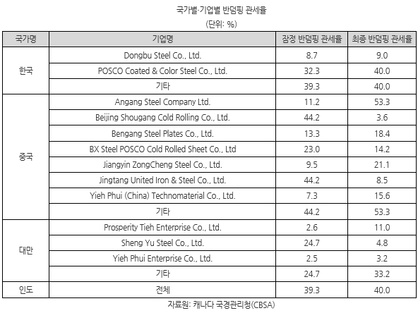 포스코강판의 덤핑 관세율은 32.3%에서 40.0%로 높아졌다. 동부제철도 8.7%에서 9.0%로 소폭 상승했다. 이외 한국 업체들의 캐나다향 부식방지 도금강판 수출에는 40.0%의 관세율이 적용된다.