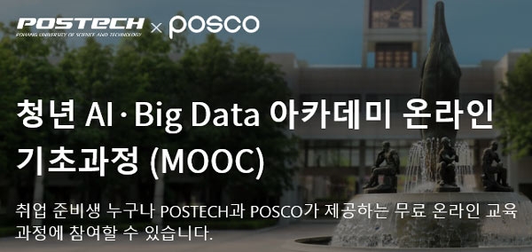 [글로벌이코노믹 윤용선 기자] 포스코가 포스텍과 공동으로 개설한 인공지능(AI)과 빅데이터(Big Data) 온라인 기초 무료 강좌가 큰 인기를 얻고 있다. 지난 1월 14일부터 수강신청을 받기 시작한 후 한 달만에 5천여명(19일 기준)이 수강 중이다. 포스텍 관계자는 “취준생들로부터 수업에 대한 호평이 이어지면서 일주일 간격으로 1천여명씩 수강생이 늘고 있다”고 전했다.