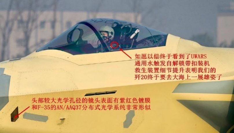 이 사진에 올라온 J-20의 DAS는 카메라가 크고 적보라색 코팅을 했지만 F-35의 AN/AAQ-35와 흡사하다고 중국 포스팅은 설명했다.