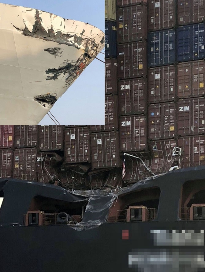 이미지 확대보기5일 트레이즈윈드와 부산항 등에 따르면, 덴마크 컨테이너선사의 남아프리카공화국 지사가 운용하는 선박과 독일 NSB홀딩스가 이스라엘 글로벌 컨테이너선사인 ZIM에 용선을 한 선박이 지난 2일 오전 8시께 부산항에서 충돌했다.