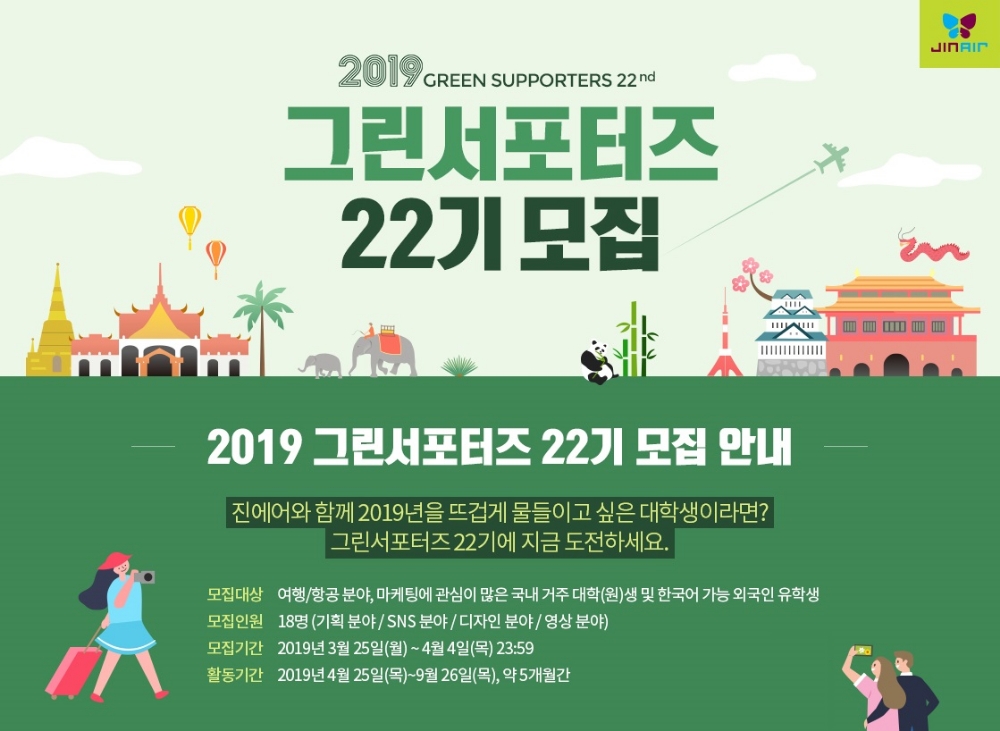 해외여행에 결격 사유가 없는 대학교 또는 대학원 재(휴)학생이면 누구나 지원이 가능하며, 진에어 홈페이지에서 접수하면 된다. 모집인원은 기획, SNS, 디자인, 영상 분야를 포함해 총 18명이며, 최종합격자 발표는 4월22일이다.