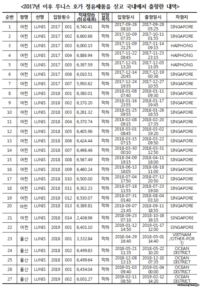이미지 확대보기유기준 의원은 VOA에 “루니스 호가 2017년 이후 한국에서 총 27차례 정유제품 16만5400t을 싣고 나갔다”고 주장했다. 유 의원은 “이 중 울산에서 출항한 5차례 중 4차례는 출항 시 차항지를 해상구역(Ocean District)으로 신고해 항만운영 시스템상으로 과연 이 제품들이 어디로 흘러갔는지 확인할 수 없는 상황”이라고 말했다.