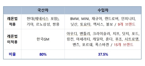 레몬법을 적용하지 않고 있는 브랜드는 국산차가 한국GM 1곳, 수입차는 아우디·벤틀리·크라이슬러·지프·닷지·포드·링컨·마세라티·캐딜락·혼다·푸조·시트로엥·벤츠·포르쉐·폭스바겐 등 15곳이다.