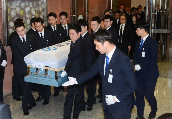 이미지 확대보기조 회장의 영결식이 이날 오전 6시 서울 신촌 세브란스병원 장례식장에서 조원태 대한항공 사장 등 친인척 및 그룹 임직원의 애도 속에 한진그룹 회사장으로 엄수됐다.
