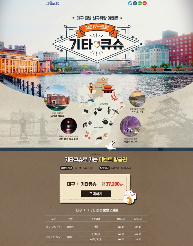 대구-기타큐슈 노선은 에어부산이 대구국제공항에서 운항하는 9번째 국제선 노선으로 6월5일부터 매일 1회 운항할 예정이다. 대구국제공항에서 매일 오전 6시40분 출발하며, 기타큐슈 현지에서는 오전 9시에 출발한다.(월·화·금 오전 8시35분 출발) 대구에서 기타큐슈까지는 약 1시간 정도의 비행시간이 소요된다.