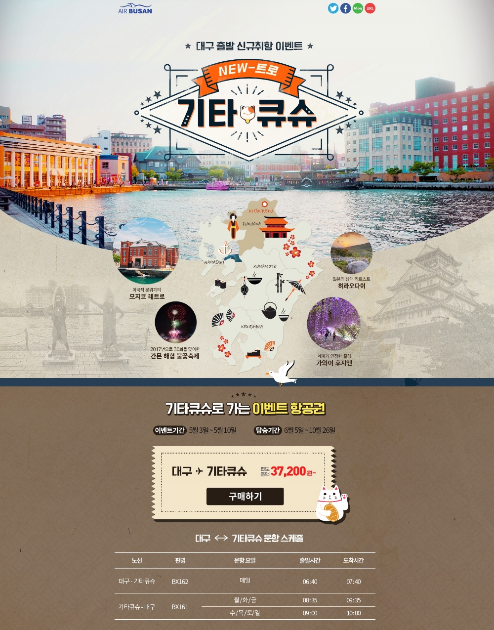 기타큐슈는 아직 한국인들에게 많이 알려지지는 않았지만 모지코 레트로 타운, 고쿠라 성 등 유명 건축물과 함께 일본의 '원조 미식도시'로 불리며 다양한 전통음식과 독특한 재래시장 먹거리 등이 유명한 도시다. 무엇보다 일본 고속열차로 후쿠오카까지 20분이면 갈 수 있어 에어부산의 대구-후쿠오카 항공편을 이용해 두 도시 모두를 즐길 수 있다.
