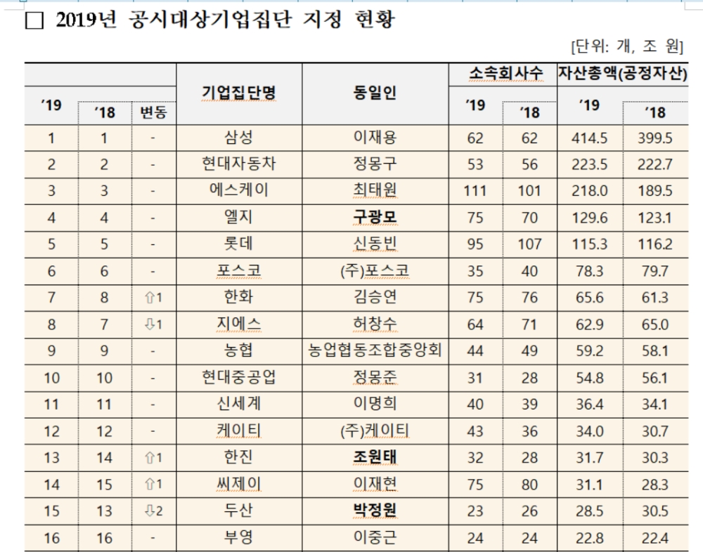 공정위는 15일 '2019년 자산 5조원 이상 공시대상기업집단 지정 결과'를 발표했다.