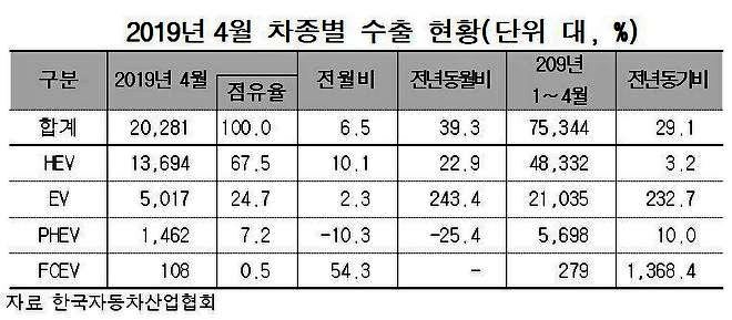 4월 전기차는 현대차 코나와 아이오닉, 하이브리드차는 기아차 니로 등이 유럽과 북미지역 수출을 주도하면서 전체 수출은 전년 동월보다 39.3% 급증한 2만281대를 기록했다.