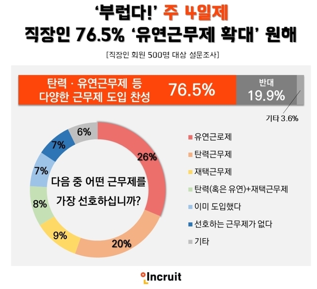 22일 취업포털 인쿠르트가 직장인 500명을 대상으로 유연근무제 도입에 대한 의견을 물은 결과, 직장인의 76.5%가 찬성한 것으로 나타났다.