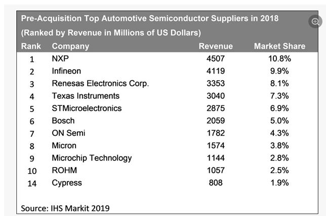 또한 사이프레스는 자동차에서 앞으로 더욱더 중요한 기능이 될 와이파이와 블루투스 제품군을 제공해왔고 다양한 전력 관리 IC (PMIC)도 제공하고 있는 만큼 이를 추가한다면 인피니온은 ADAS와 인포테인먼트 애플리케이션용 칩 시장내 순위를 2018년 8위에서 올해 4위로 약진, 르네사스를 앞지를 것으로 IHS마킷은 전망했다.