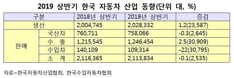 한국자동차산업협회와 한국수입자동차협회가 최근 발표한 ‘2109 상반기 자동차 산업 동향과 ‘등록대수’ 등을 본지가 9일 취합한 결과에 따르면 올해 상반기 신차 판매는 모두 211만3834대로 지난해 같은 기간(211만6365대)보다 판매가 0.1% 줄었다.