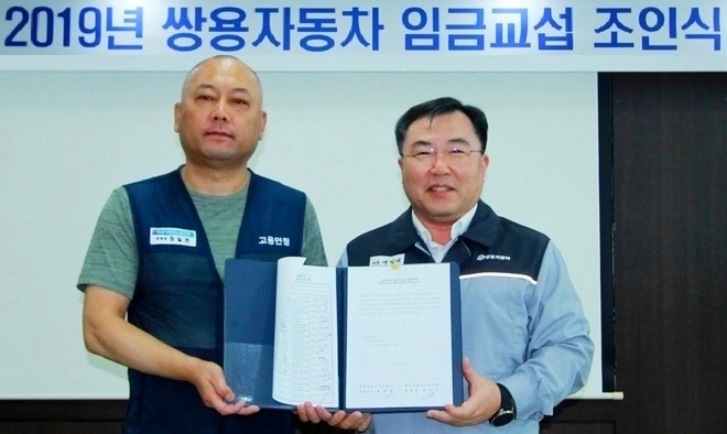 쌍용차는 16일 경기도 평택 본사에서 에병태 대표이사와 정일권 노동조합위원장이 2019년 임금협상 합의서에 서명했다고 17일 밝혔다.