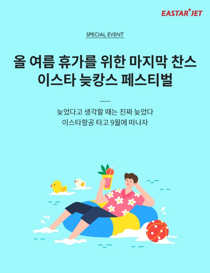 이스타항공 관계자는 "최근 7-8월 성수기 시즌을 피해 9-10월 늦은 휴가를 준비하는 비중이 늘고 있다"며 "특히 9월은 더위가 한풀 꺾여 여행하기 좋은 계절로 이번 늦캉스 페스티벌을 활용해 좋은 여행의 추억을 만드길 바란다"고 말했다.