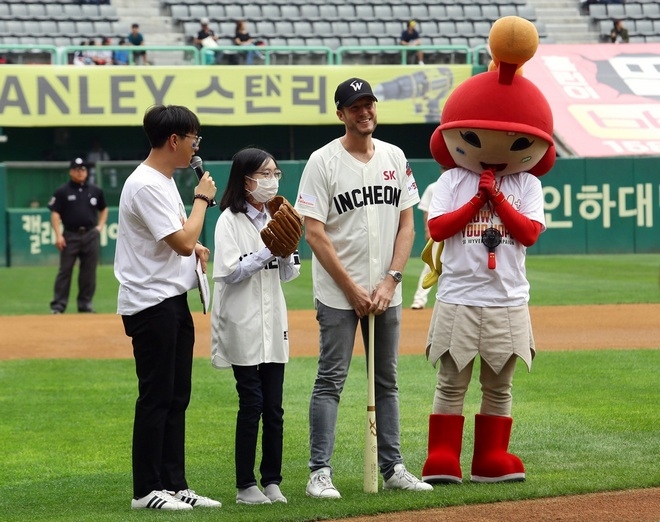 이미지 확대보기1일 경기에서 희귀 질환을 앓고 있는 소녀(왼쪽 두번째) 시구자로, 슈테판 크랍 사장(오른쪽 두번째)이 시타자로 각각 나섰다. 사진=폭스바겐 부문
