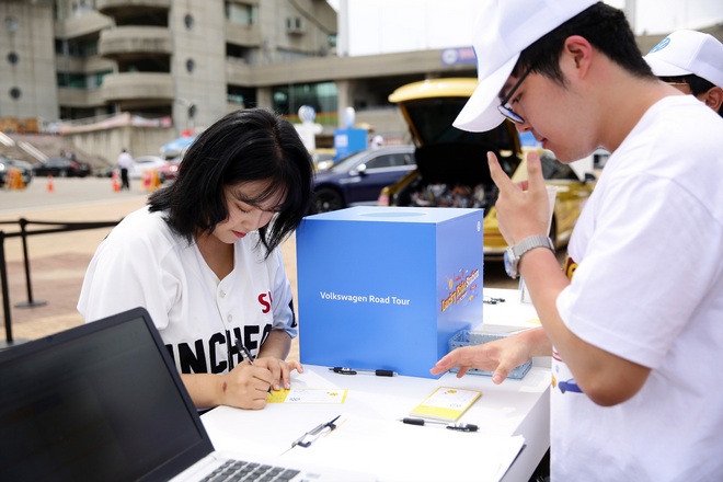 이미지 확대보기한 여성 관람객이 경품 추첨에 응모하고 있다. 사진-폭스바겐 부문