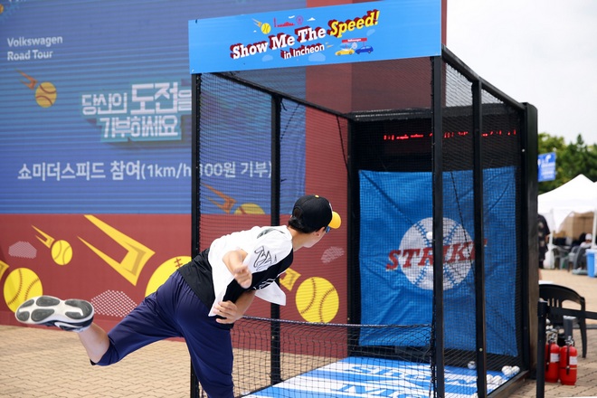 이미지 확대보기쇼미더스피드는 관람객이 던진 공의 구속 1㎞/h당 100원씩 기부하는 이벤트이다. 지난 주말 2027명이 참여해 1013만7000원의 기부금이 모였다. 기부금은 SK와이번스가 후원하고 있는 희귀질환아동에게 전액 전달됐다. 사진=폭스바겐부문
