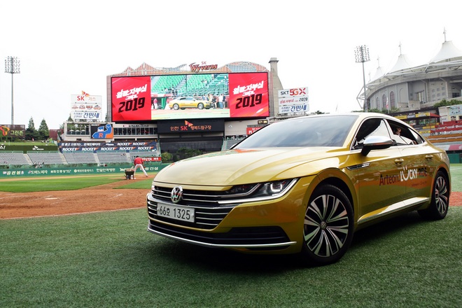이미지 확대보기전광판에는 폭스바겐의 대형 세단 아테온 영상이 나왔으며, 1루 쪽에 아테온이 전시됐다. 사진=폭스바겐부문