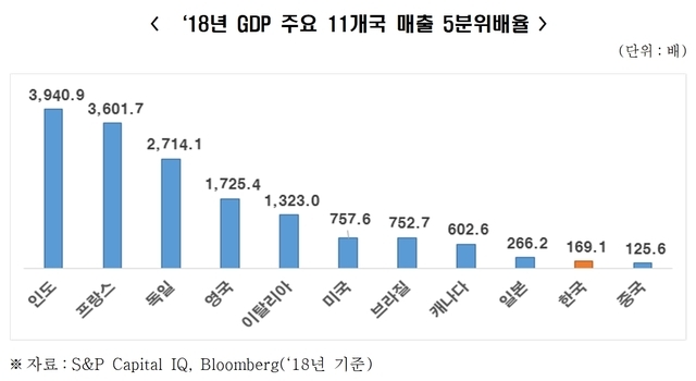 국별 매출 5분위 배율은 ▲인도 3940.9 ▲프랑스 3601.7 ▲독일 2714.1 ▲영국 1725.4 ▲이탈리아 1323.0 ▲미국 757.6 ▲브라질 752.7 ▲캐나다 602.6 ▲일본 266.2 ▲한국 169.1 ▲중국 125.6 순이었다.