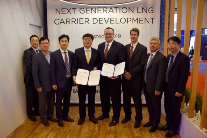 이미지 확대보기로이터 통신 등 외신은 18일(현지시간) “최근 미국에서 열린 가스오일 산업전시회 ‘가스텍 2019’에서 삼성중공업과 ABS가 공동개발 프로젝트에 서명하고 차세대 LNG운반선을 개발하기로 계약을 체결했다”고 보도했다.