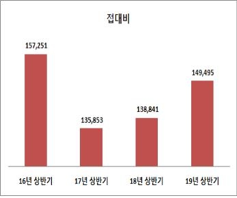 접대비를 지출한 법인 수는 41만9420개에서 74만215개로 76.5% 증가했다.