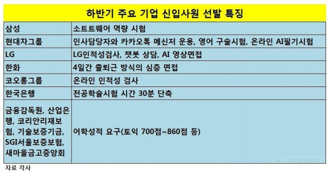 10개 계열사에서 신입 직원을 뽑는 LG그룹은 인적성검사와 AI 영상면접, 챗봇(상담용 로봇)상담, 정보기술자격(ITQ)시험 등을 치른다.