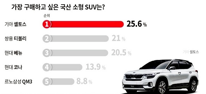 전체 응답자 25.6%의 선택을 받은 셀토스는 고급스러운 디자인에 넉넉한 공간, 우수한 연비를 갖춰 신차 시장에서도 인기를 끌고 있다. 7월 출시 이후 3개월 만에 누적 계약 2만 6000대, 누적 판매 1만6000대로 소형 SUV 1위를 기록했다.