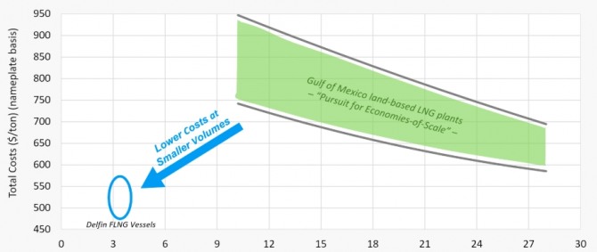 이미지 확대보기델핀이 밝힌 자료에 따르면, 델핀은 현재 4개의 FLNG 선박 슬롯(정박 가능한 장소)을 보유하고 있으며 연간 1300만t LNG 수출이 가능한 LNG 시설을 보유하고 있다. FLNG 선박을 도입하면 LNG생산시 t당 500~550달러의 비용을 절감할 수 있다.