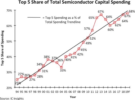 이들 설비 투자 비중은 지난 1994년 25% 수준에서 반도체 업체가 급격히 줄어들기 시작한 2010년 50%를 돌파했고, 이후엔 2013년과 2018년이 67%로 비중이 가장 높았다.