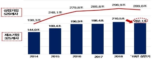 제조업의 경우는 210조5000억 원에서 202조1000억 원으로 4% 줄어든 것으로 조사됐다.