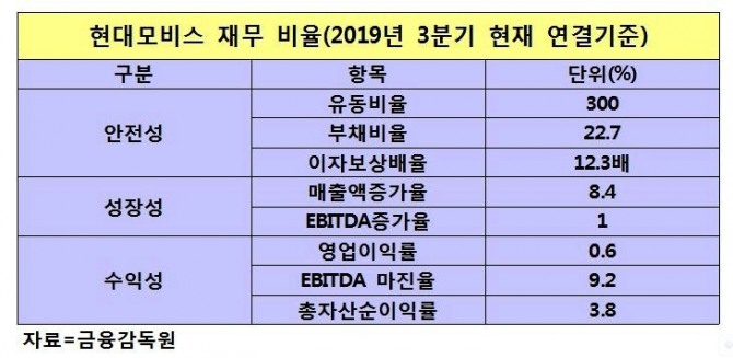 이에 따라 현대모비스의 채무상환 능력인 이자보상배율(영업이익÷금융비용)은 12.3배이다.
