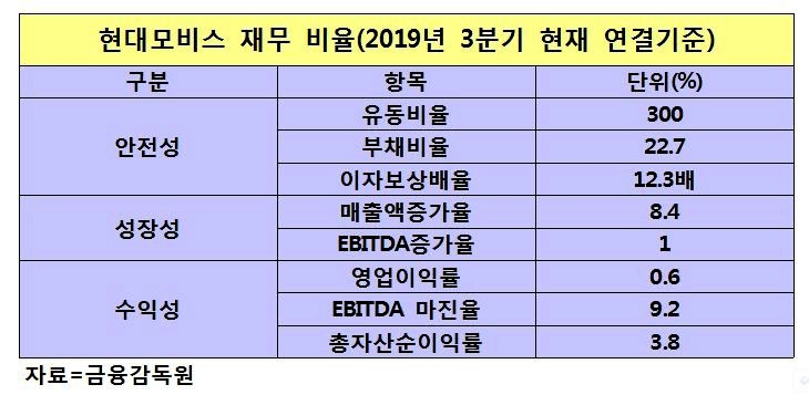 현대모비스의 올해 1∼3분기 연결 기준 재무구조를 분석하면 안전성, 수익성, 성장성이 모두 탁월하다.