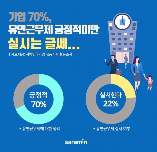 30일 사람인이 454개 기업을 대상으로 설문한 결과, 이들 기업의 70%는 유연근무제를 '긍정적'으로 생각한다고 응답했다.