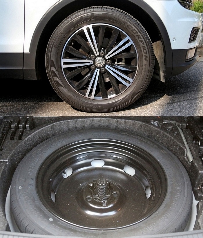 이미지 확대보기(위부터)신형 티구안의 18인치 알로이 휠에 실린 폭 235㎜ 래디얼 타이어는 변함이 없지만, 편평비가 5% 증가한 55%로 우수한 승차감을 구현했다. 트렁크에는 템퍼러리 스페어타이어가 실렸다. 사진=정수남 기자