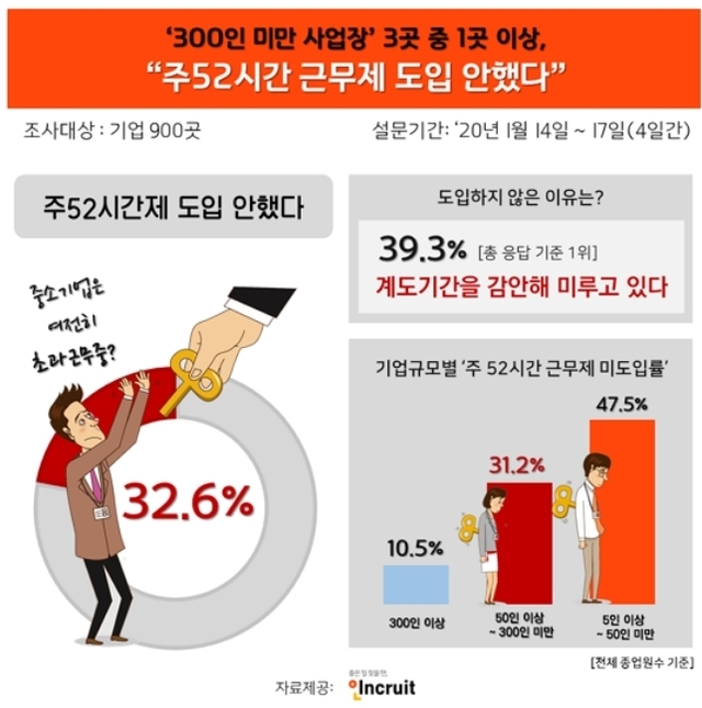 올해부터 50인 이상 300인 미만 사업장 대상으로 주 52시간제가 전면 시행됐지만, 여전히 33%의 기업은 도입하지 않은 것으로 나타났다.
