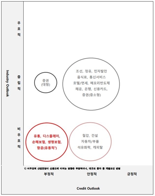 중·소형 증권회사를 포함한 16개 산업의 신용등급 전망은 '안정적', 항공운송업의 신용등급 전망은 '유동적'으로 분류됐다.