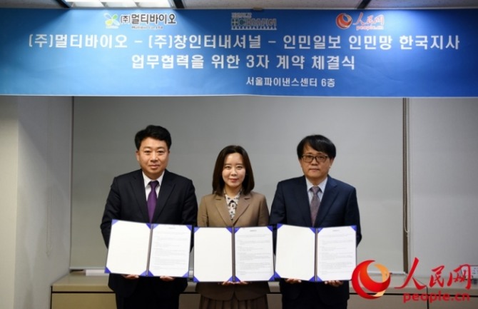 이미지 확대보기3일 인민망 한국어판에 따르면, 멀티바이오와 창인터내셔널은 중국 인민망 한국지사와 살균소독제 '싹수'의 중국 진출을 위한 업무협약을 맺었다.