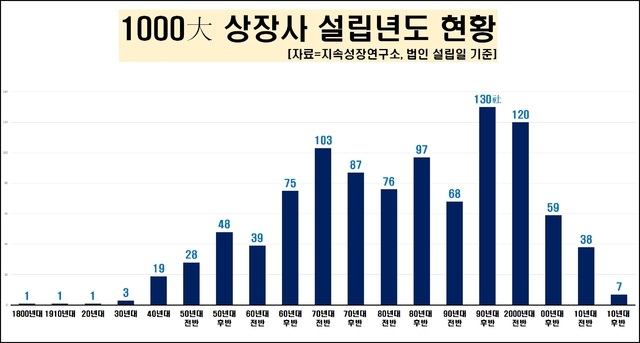 1995∼1999년 세워진 회사가 130개, 2000∼2005년 설립 회사 120개, 1970∼1974년 103개, 1985∼1989년 97개, 1975∼1979년 87개, 1965∼1969년 65개 순으로 분석됐다.
