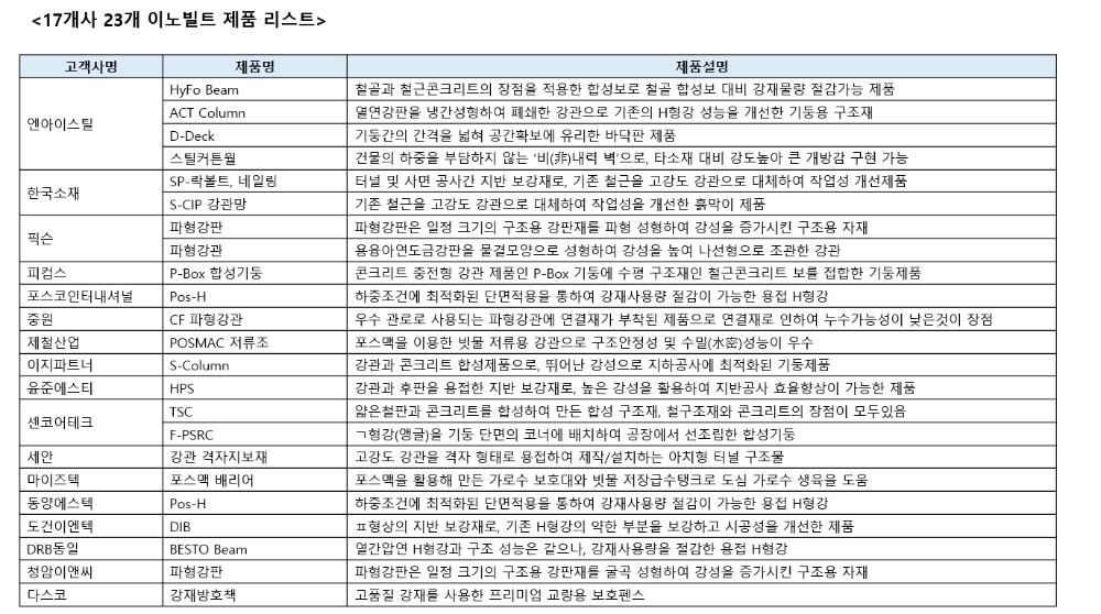 협약식에 앞서 포스코는 ‘이노빌트 브랜드위원회’를 개최해 고객사의 강건재 상품중 포스코 철강을 사용하고 품질과 성능이 우수한 23개 제품을 이노빌트로 선정했다. NI스틸은 하이포빔(HyFo Beam), 스틸커튼월 등 4개 상품이 이노빌트 제품으로 인증을 받았다.