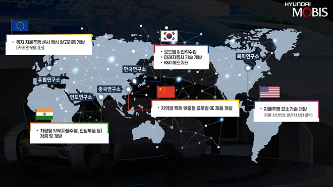 한편 현대모비스는 국내 기술연구소를 기점으로 미국·독일·중국·인도에 글로벌 R&D 네트워크 협업 체계를 구축하고 있고 총 5000여 명의 연구 인력들이 근무하고 있다.