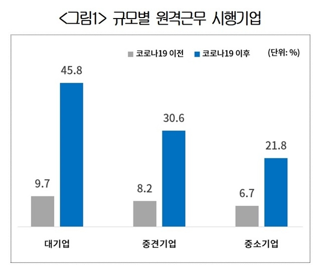 코로나19 이전 원격근무 시행기업은 대기업 9.7%, 중견기업 8.2%, 중소기업 6.7%에 그쳤지만, 코로나19 이후에는 대기업 45.8%, 중견기업 30.6%, 중소기업 21.8%로 기업 규모에 따라 최대 5배 가까이 늘었다.