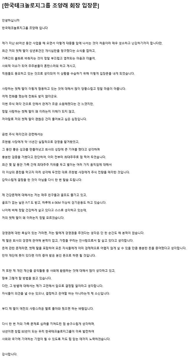 이어 조 회장은 "부디 내 딸이 예전의 사랑스러운 딸로 돌아와 줬으면 하는 바램이다"라며 "다시 한번 가족 문제로 심려를 끼쳐드린 점 송구스럽게 생각하며 내년이면 창립 80년이 되는 우리 한국테크놀로지그룹이 더욱 발전해 사회와 국가에 기여하는 기업이 될 수 있도록 힘 닫는 데까지 노력하겠다"라고 말했다.