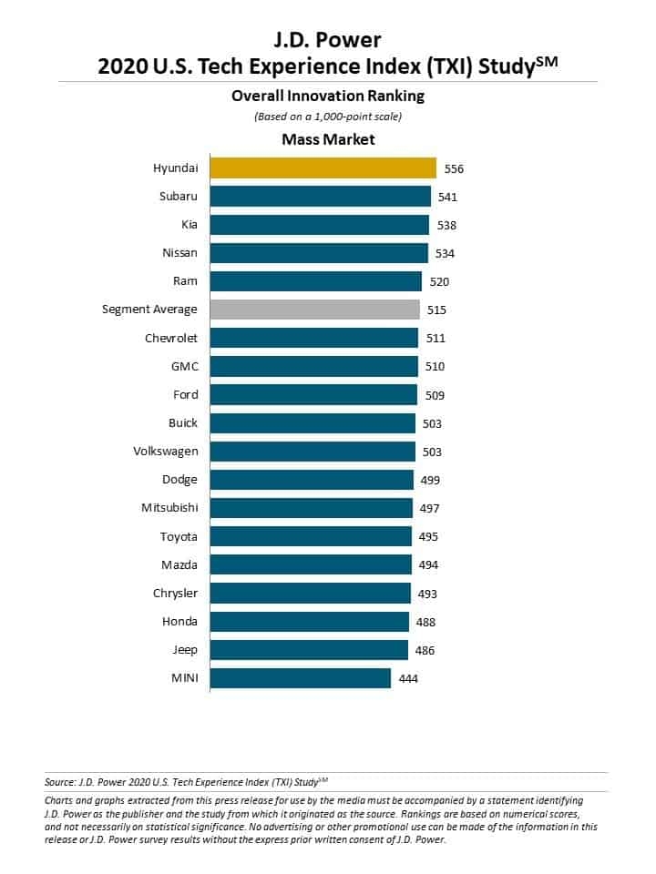 점수는 운전자 중심의 첨단 자동차 기술에 대한 고객 경험과 사용도, 상호 작용 등을 측정해 매겨지며 올해 TXI 지수는 2020년 모델을 신차로 구입하거나 리스 후 90일이 경과한 고객 8만2527명을 대상으로 작성됐다.