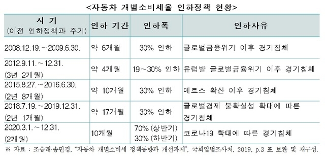 자동차 개별소비세 인하 정책은 그 시행 주기가 3년 2개월에서 2년 8개월, 2년 1개월, 2개월로 점차 짧아지고 있다.