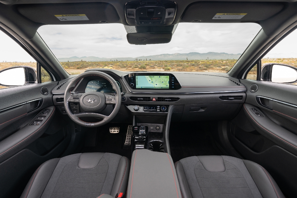 쏘나타 N라인 실내는 도어 트림과 센터 콘솔(운전석과 동승석 사이 수납 공간), 대시보드가 검정색에 가까운 진회색 가죽으로 마감됐고 붉은색 박음질이 된 모습이 돋보인다.