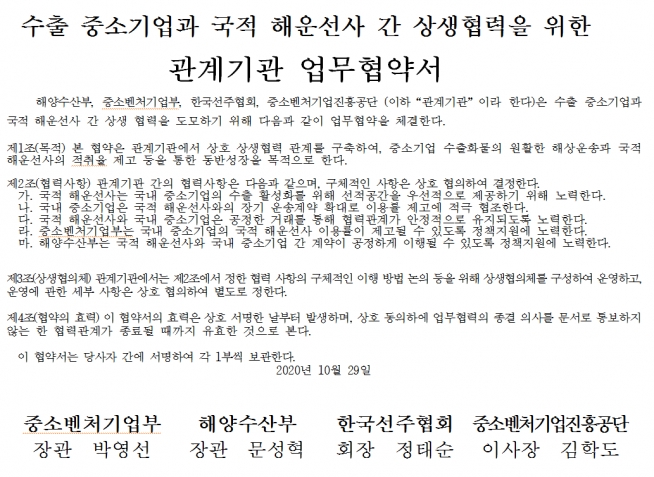 이날 행사에는 박영선 중기부 장관, 문성혁 해수부 장관, 김학도 중진공 이사장, 정태순 선주협회 회장, 배재훈 HMM 사장 등이 참석했다.