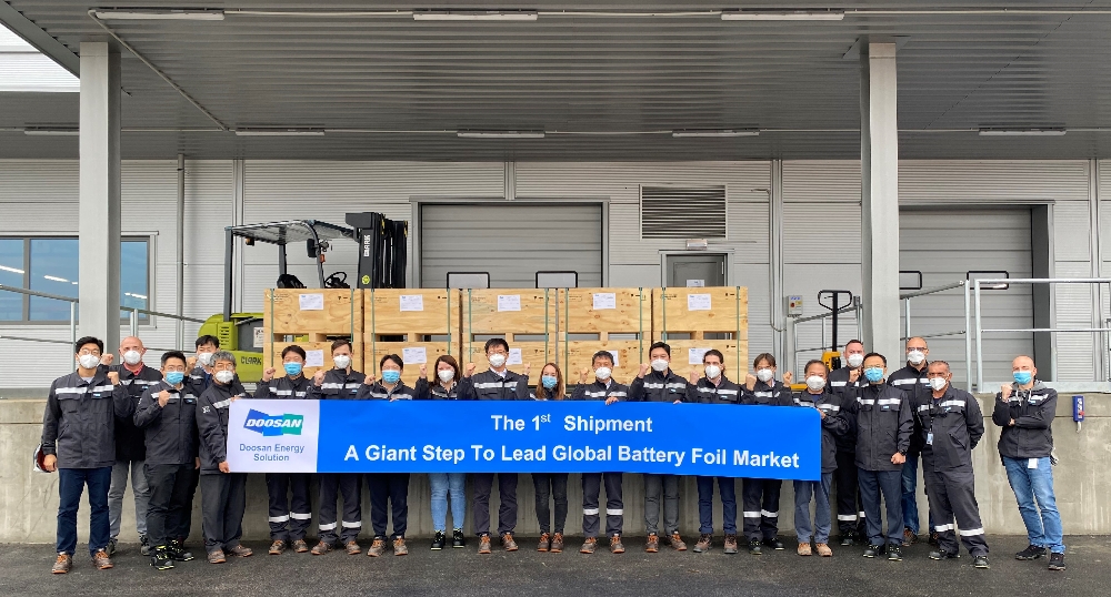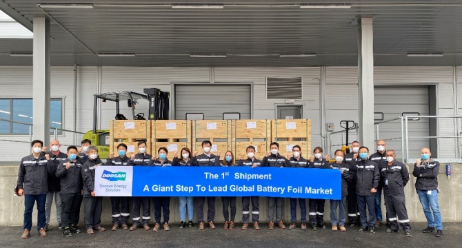 두산솔루스는 올해 4월 시양산 샘플(양산 시작 전 테스트 제품) 공급을 시작해 7개월 만에 글로벌 배터리 고객사 품질 평가와 인증을 모두 통과해 본격적인 전지박 공급을 시작하게 됐다.