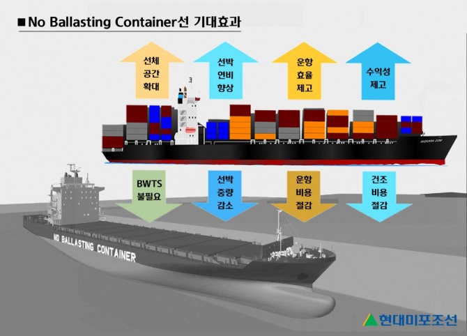 현대미포조선은 고려해운에서 운항 중인 선박 6척을 대상으로 최근 1년간 운항실적 자료를 토대로 화물적재 능력, 운항 효율성 등을 심층 분석한 뒤 선체에 싣는 평형수를 고체 중량물과 이동식 영구 평형수(Permanent Ballast Water)로 대체해 평형수를 바다에 배출하지 않아도 되는 컨테이너선에 대한 기본설계를 마쳤다.