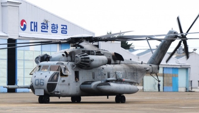 CH-53E 슈퍼스텔리온은 미군이 보유한 헬기 중 가장 크고 무거운 것으로 알려졌다. 4000마력 엔진 3개를 장착하고 있으며 최대이륙중량은 F-15전투기와 엇비슷한 33t이다.