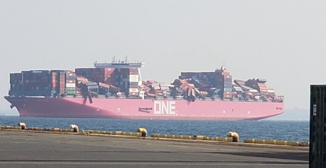 이미지 확대보기12일 지캡틴 등 해운 전문 매체에 따르면, 태평양 한가운데까지 나간 원 아푸스호에 탑재된 컨테이너가 바다로 추락함에 따라 지난 8일(현지시각) 일본 고베항으로 회항했다. 미국으로 항해하다 태평양 한 중간에 있다가 8일간 회항해 일본 항구에 도착했다.